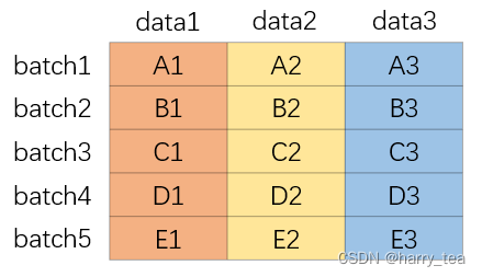 对于一维数据如下所示,每一行对应的是每一个batch,每一列是这个batch对应的数据维度,比如第一行第一列是第一个batch的第一维数据,第二列是第一个batch的第二维数据,以此类推。我们在批归一化的时候就是对不同patch的相同维度进行的,比如这里就是A1,B1,C1,D1...