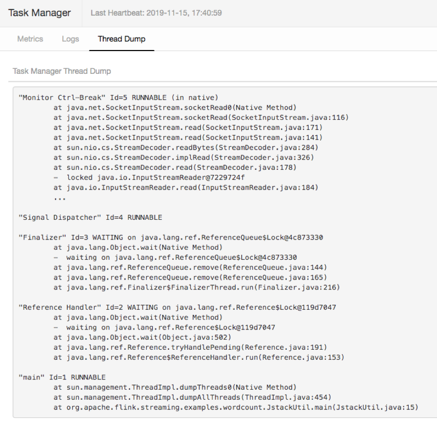 Thread Dump 对一些作业的问题定位非常有帮助,1.11 之前用户必须要登录到 TM 所在机器来执行 Thread Dump 操作。1.11 的 WEB UI 集成了这一功能,它增加了 Thread dump 标签页,允许用户直接通过 WEB UI 来获得 TM 的 Thread Dump。