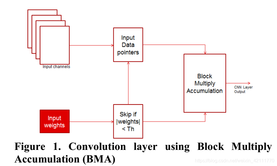 将上述代码里面的循环可以被调换顺序,将内循环调到外面,这样每一次整个block都乘以一个单独的权重值,一次计算整个block,好处在于权重为0的时候,整个block就能够被跳过,这样的卷积计算方式被称为Block Multiply Accumulation(BMA)。