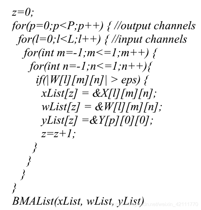 如果应用BMA计算整个卷积层,首先需要收集非零权重所对应的block指针,然后将非零权重和相应的输入和输出指针收集在单独的列表中。BMAlist()函数从xList函数中取出一个块指针,从wList中取出一个权重值,相乘,然后累积整个块到yList的指针。伪代码如下(本人认为以下的伪代码仅仅计算了输出p个通道的第[0][0]值).