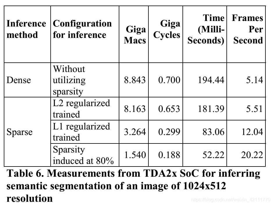 稀疏的卷积网络被应用在Texas instruments的TDA2x SoC,它有四个EVE。以下表格比较了了JSegNet21 CNN网络的稠密格式和它相应稀疏格式在处理1024x512图像分割的复杂度。