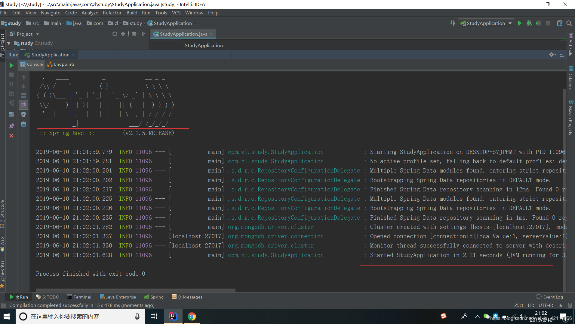 运行自动生成的xxxApplication.java ,出现如下运行结果的话,就启动成功程序了。