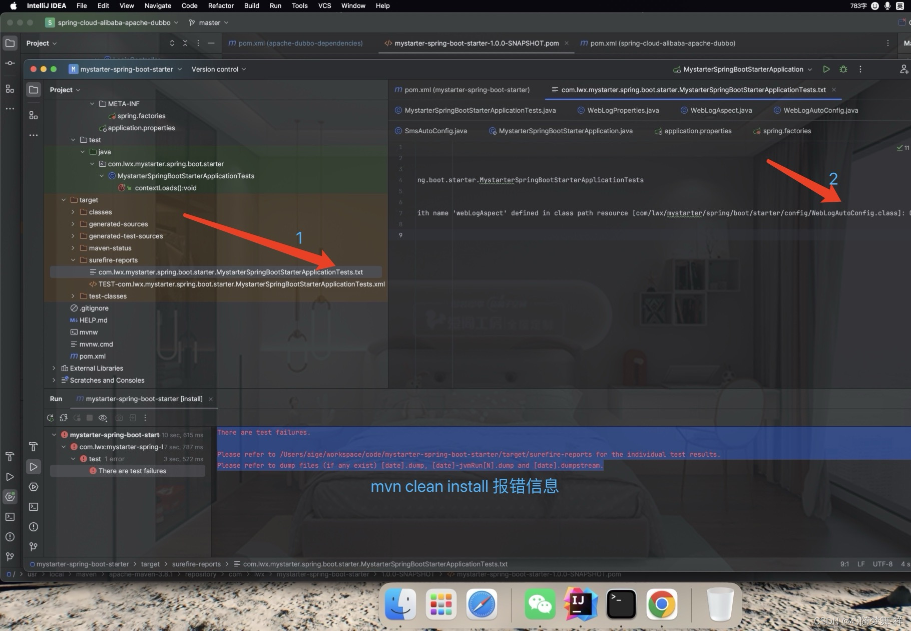 /Users/liuwuxiang/workspace/code/mystarter-spring-boot-starter/target/surefire-reports目录下。您可以打开测试报告文件,通常以XML格式提供,也可以点击打开.txt 以查看哪些测试用例失败。