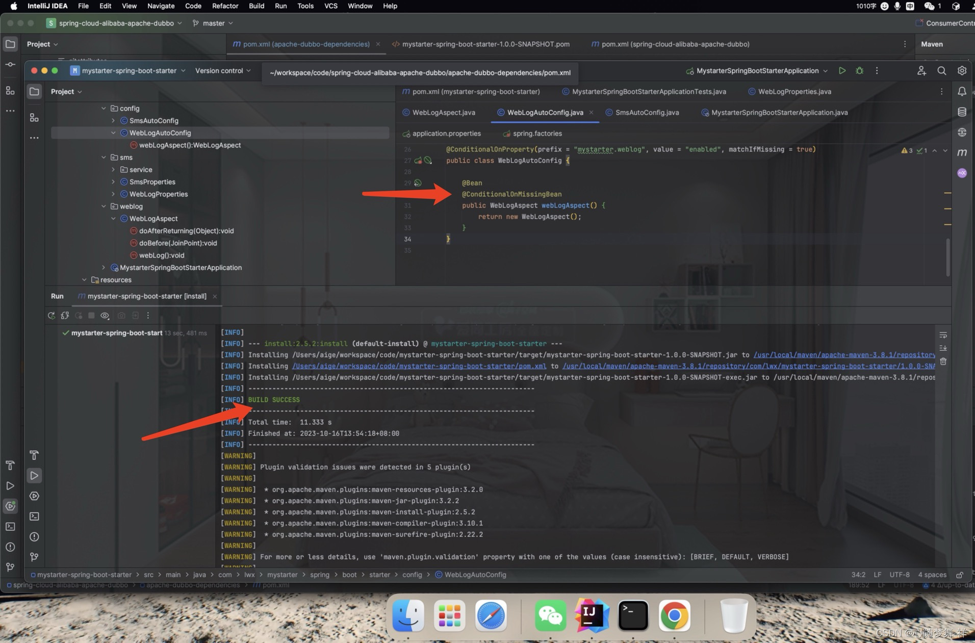 package com.lwx.mystarter.spring.boot.starter.config; import com.lwx.mystarter.spring.boot.starter.sms.WebLogProperties; import com.lwx.mystarter.spring.boot.starter.weblog.WebLogAspect; import org.springframework.boot.autoconfigure.condition.ConditionalOnMissingBean; import org.springframework.boot.autoconfigure.condition.ConditionalOnProperty; import org.springframework.boot.context.properties.EnableConfigurationProperties; import org.springframework.context.annotation.Bean; import org.springframework.context.annotation.Configuration; /** * @description 日志切面自动配置类 * @author Lwx * 1.@ConditionalOnProperty(prefix = "zzcloud.weblog",value = "enabled", matchIfMissing = true): * matchIfMissing属性:默认情况下matchIfMissing为false,也就是说如果未进行属性配置,则自动配置不生效。如果matchIfMissing为true, * 则表示如果没有对应的属性配置,则自动配置默认生效。 * * 2.@ConditionalOnMissingBean: * 在@bean定义上,它的作用就是在容器加载它作用的bean时,检查容器中是否存在目标类型(ConditionalOnMissingBean注解的value值)的bean了, * 如果存在这跳过原始bean的BeanDefinition加载动作。 * * @date 2023-10-16 10:25 */ @Configuration @EnableConfigurationProperties({WebLogProperties.class}) @ConditionalOnProperty(prefix = "mystarter.weblog", value = "enabled", matchIfMissing = true) public class WebLogAutoConfig { @Bean @ConditionalOnMissingBean public WebLogAspect webLogAspect() { return new WebLogAspect(); } }再进行 mvn install 时就可以成功了