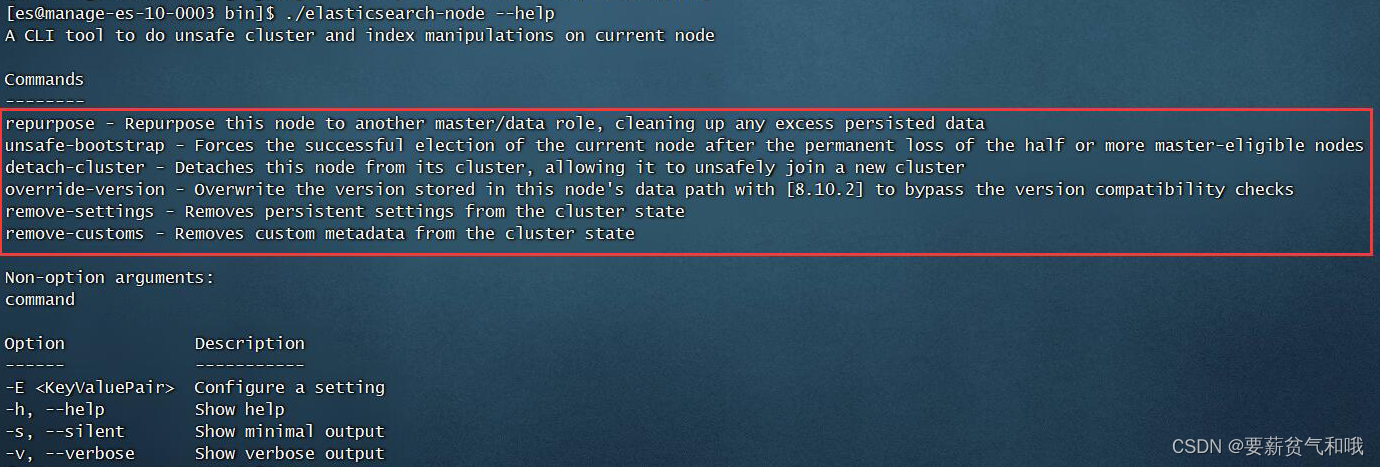 Elasticsearch的bin目录下有一个可执行文件:elasticsearch-node,包含了管理Elasticsearch 节点所需的命令和参数。其中,detach-cluster 这个命令可以将节点从集群中分离出来,加入一个新的集群。