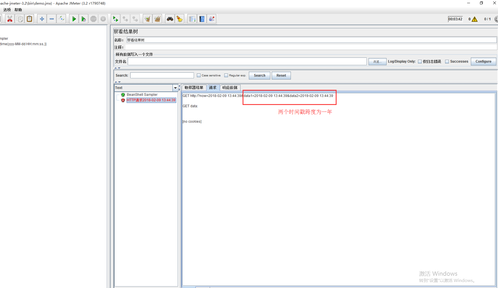 在Parameters中传递变量,执行并查看结果树,发现成功打印了跨度为一年的时间戳
