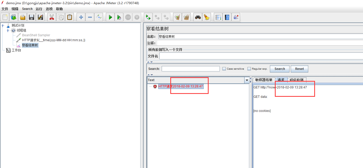 执行,查看结果树,可以看到结果中,将当前时间打印出来了哦~