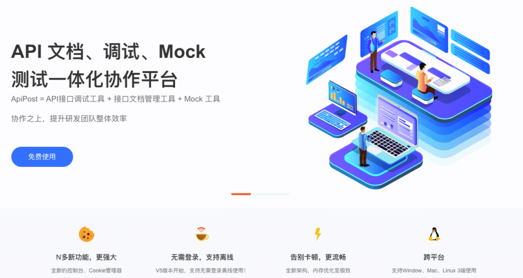 适用场景: 适合需要团队协作、注重文档管理和轻量体验的API开发团队。