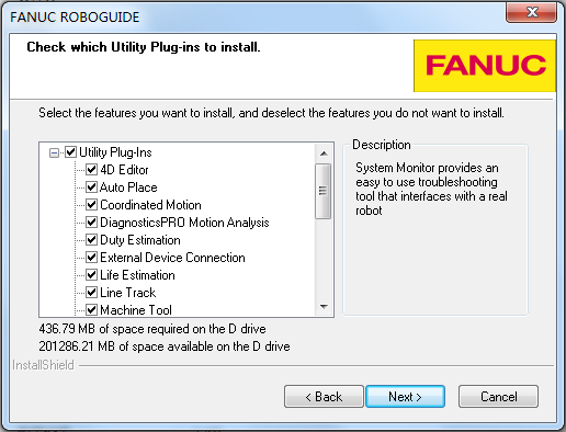7)在“FANUC ROBOGUIDE – Check which Utility Plug-ins to install”窗口中选择要安装的功能插件,建议全部勾选,然后点击“Next”按钮;