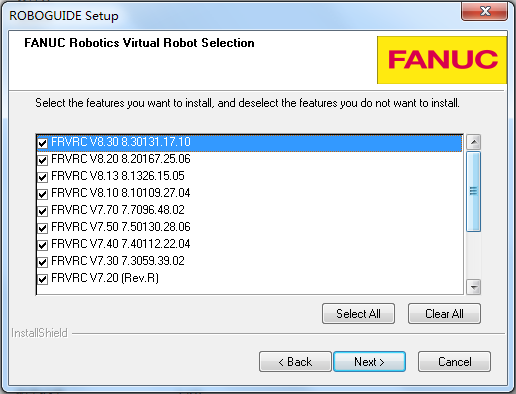 9)弹出“ROBOGUIDE Setup – FANUC Robotics Virtual Robot Selection”窗口,选择要安装的虚拟机器人系统版本,建议全部勾选,然后点击“Next”按钮;