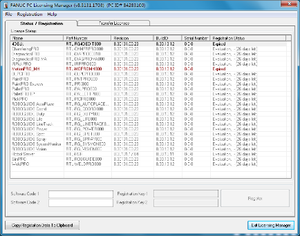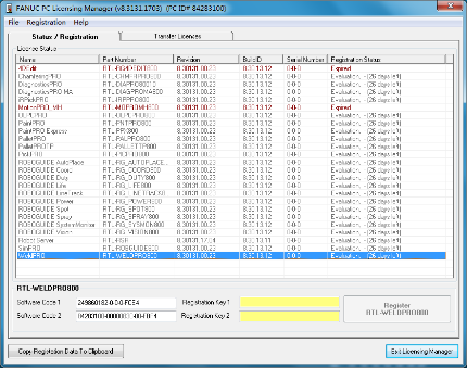 2)点击要注册的模块,如WeldPRO模块,在下方的“Software Code1”、“Software Code2”处出现申请码,将申请码发送给FANUC厂商购买注册码;