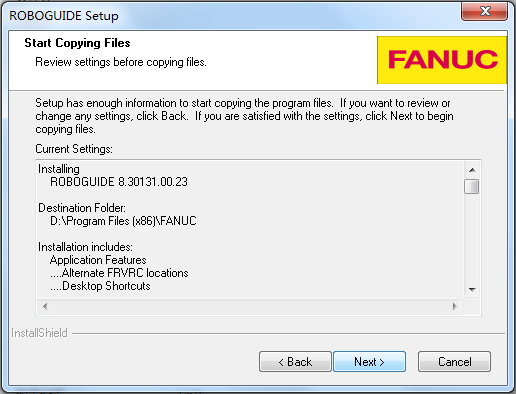 10)弹出“ROBOGUIDE Setup – Start Copying Files”窗口,检查装信息,确认无误后点击“Next”按钮;