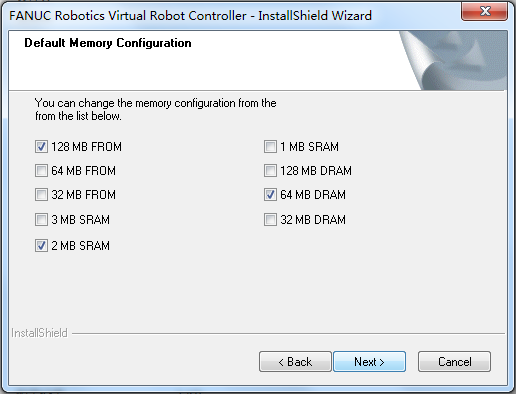 14)弹出“FANUC Robotics Virtual Robot Controller – InstallShield Wizard – DefaultMemory Configuration”窗口,勾选虚拟虚拟内存,建议保持默认,之后点击“Next”,进入下一步;