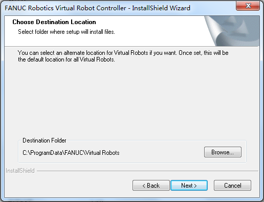 13)弹出“FANUC Robotics Virtual Robot Controller – InstallShield Wizard –Choose Destination Location”窗口,点击“Browse”按钮,选择软件安装目录,之后点击“Next”,进入下一步;