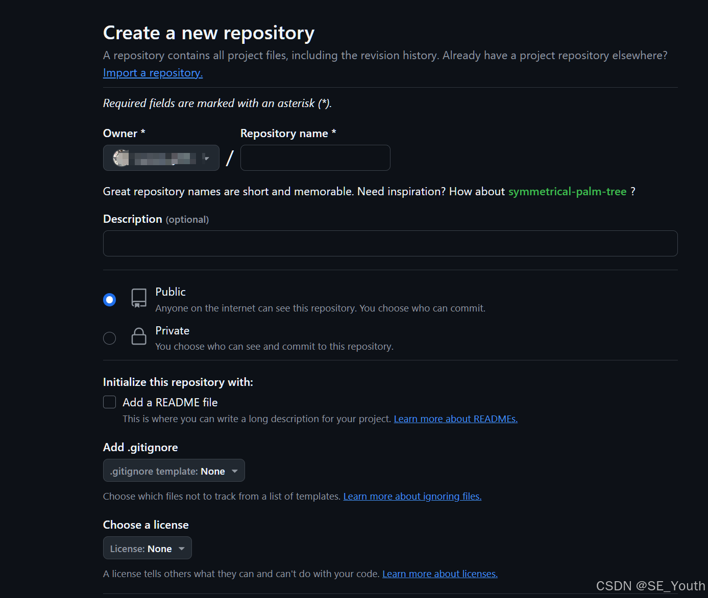 Public/Private:公共/私有,选择该仓库是公开还是私有,公开的仓库,其他用户也能查看和克隆,私有的仓库只有受邀者才能访问;
