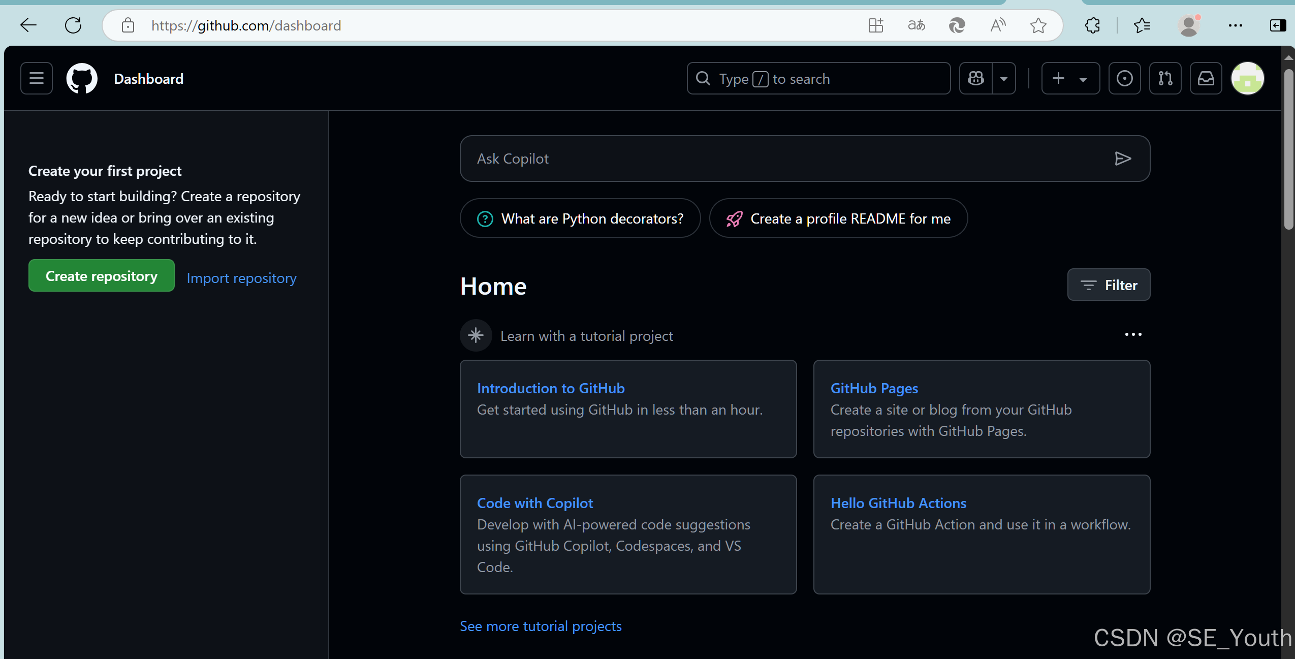 登录之后的界面如下,至此,就已成功注册了一个 GitHub 账号,可以打开个人信息界面,修改头像、个人简介等信息。