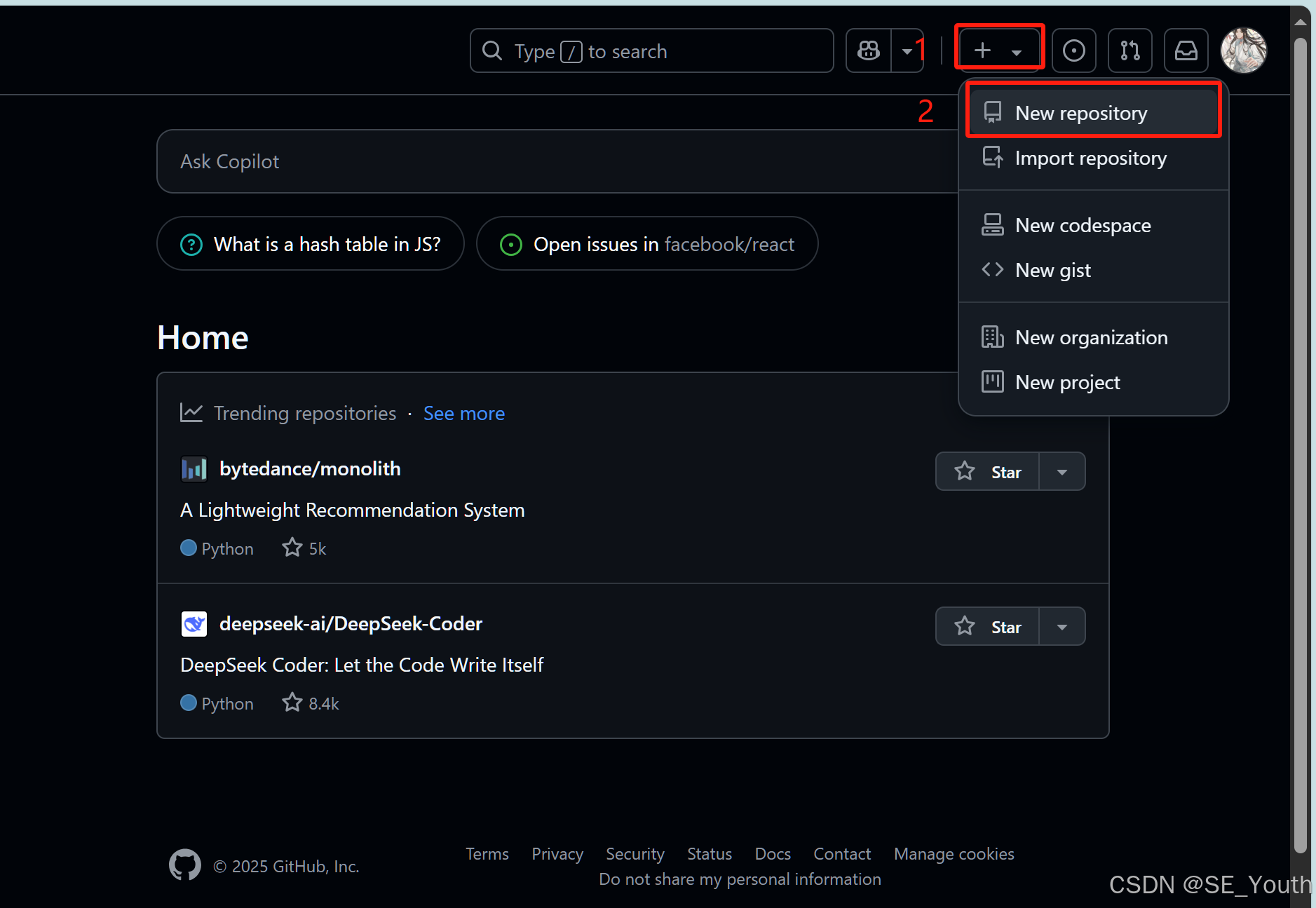 1. 点击下图中的 “+”,在弹出的选项中选择 “New repository”