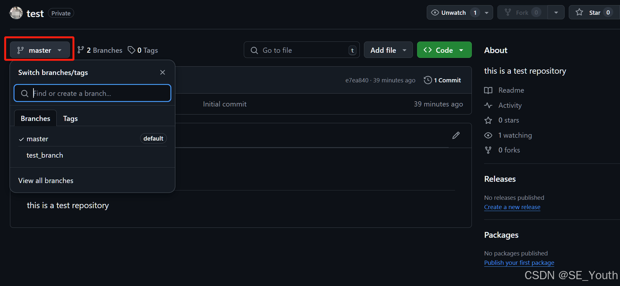 点击 master 旁边的下拉箭头,可以创建新的分支或者切换到其他分支。