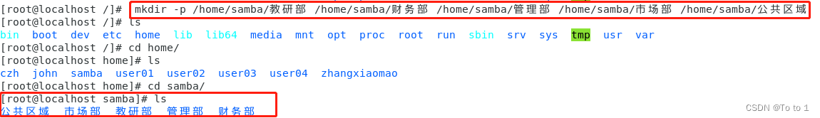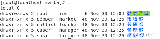 # mkdir -p /home/samba/教研部 /home/samba/财务部 /home/samba/管理部 /home/samba/市场部 /home/samba/公共区域