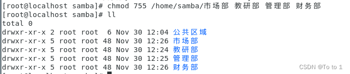 # chmod 755 /home/samba/市场部 教研部 管理部 财务部