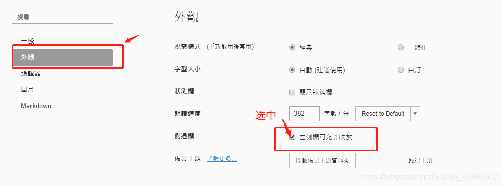 2、选择 "外观"⇒勾选"左侧栏可允许收放" (此处我的字体版本是繁体,可能有所差别)