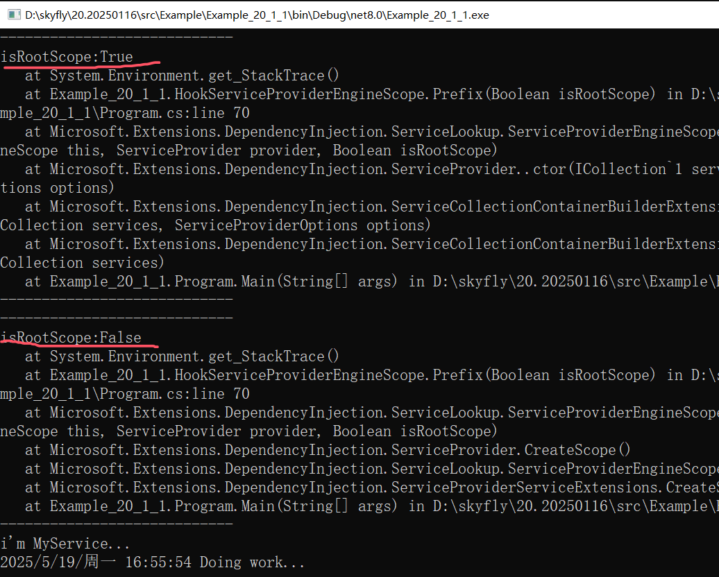 有些朋友可能要说了,这地方为什么会有两个调用栈,熟悉底层的朋友应该知道分别由 services.BuildServiceProvider 和 serviceProvider.CreateScope 贡献的。