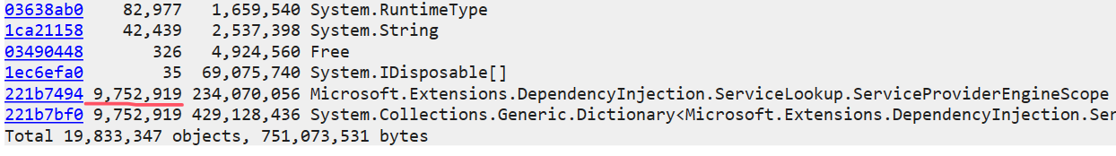 所以这个就是很无语的事情了,哈哈,上面所说的其实就是我最近遇到了一例 .NET托管内存暴涨 问题,观察托管堆之后,发现有 975w 的 ServiceProviderEngineScope 类,截图如下: