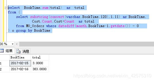 查询出本月的每天的数据总和,显示每天的,查询语句如下: