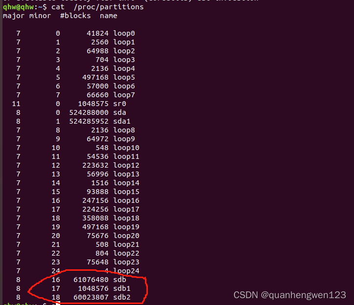 - 可以使用cat /proc/partitions命令,查看设备的分区情况