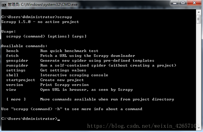 然后,Scrapy的whl包使用同样的安装方式安装即可。安装完成后,再次在命令窗口输入:Scrapy 查看是否安装成功(安装成功后如下图):