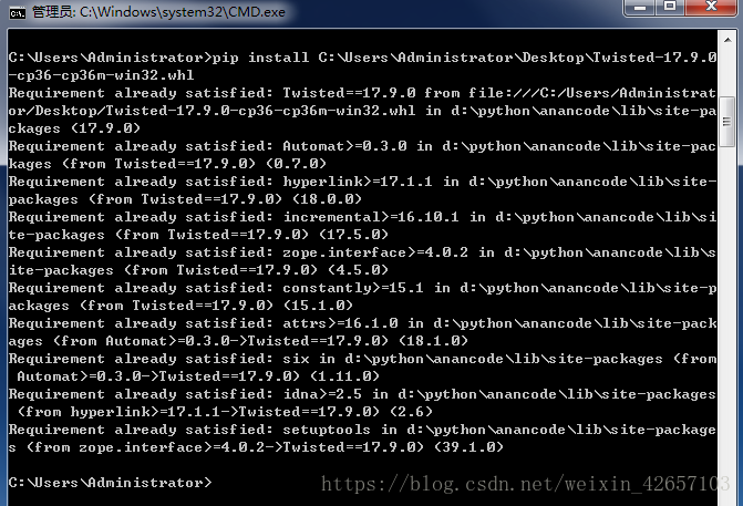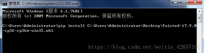 Twisted包安装后,用cmd再次进入到Windows命令执行窗口,输入: pip install 并将刚才下载好的Twisted包直接拖动到命令窗口里面,回车安装即可。