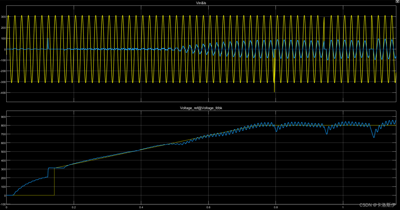 基于以上的需求,通过Simulink模拟PFC电压跌落测试。如下图,分别是预充电,空载到慢慢加负载的波形。系统稳定后测试了三次电压跌落。