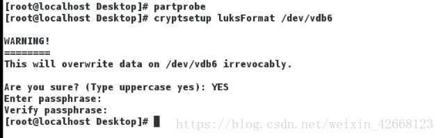 cryptsetup luksFormat /dev/vdb6 #加密/dev/vdb6 确认时候YES为大写