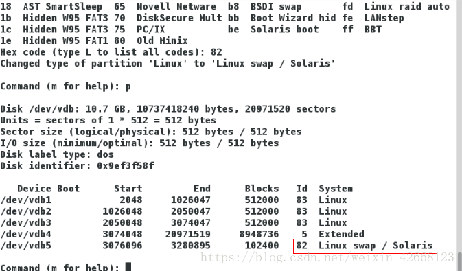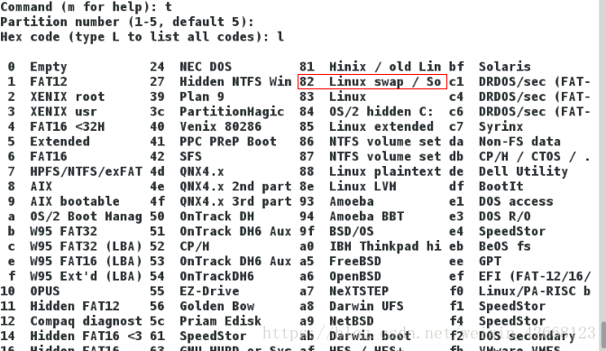 t 键改变分区功能id,选择vdb5 ,l 键查看命令帮助,可以看到红色框的部分为 swap 格式 ,前面的代码为 82