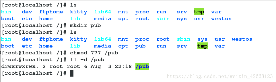 在根下建立新目录 /pub,因为要求普通用户对其可写,所以给其权限