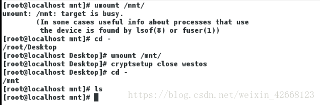 可以看到第一次卸载挂载是失败的,是因为你正在 /mnt 下面,而占用了进程,需要退出,再卸载挂载
