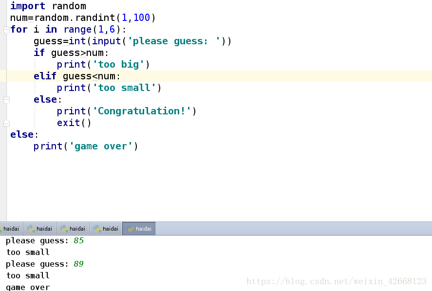 4. 如果用户猜测的数字小于系统给出的数字,打印"too small";