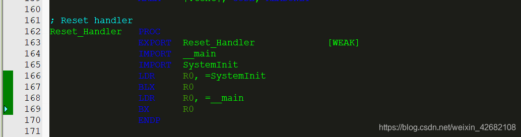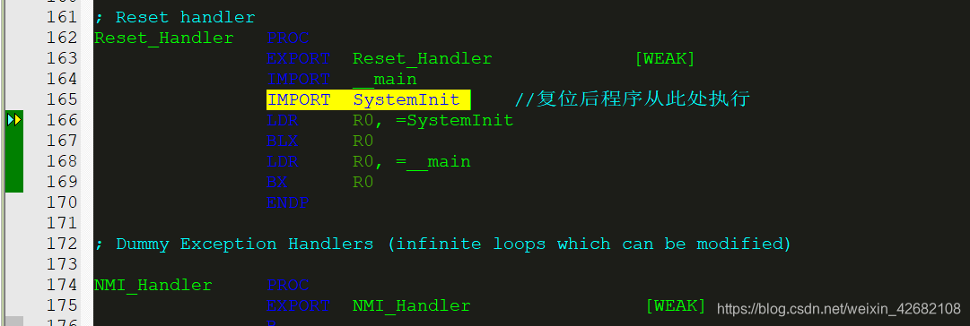 首先,进入调试界面,并点击复位按钮光标就可以跳到程序开始运行的地方。如: