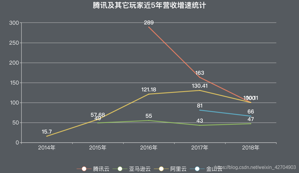 然后在增长速度上,由于腾讯在近5年来仅在2018全年业绩中首次单独披露云业务营收同比增长数据,但是为了直观的与其它厂商进行对比,本文摘取了2016年、2017年财报中包含云计算业务相关的增长数据,分别为289%、163%和100%,远远高于亚马逊AWS、金山云等其它厂商。