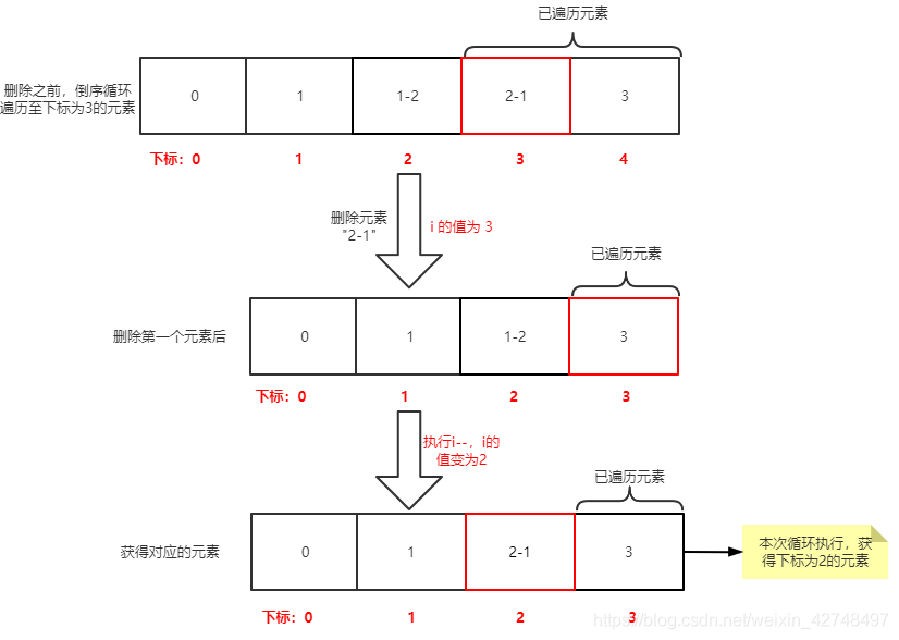 这个时候,下标产生变化的元素为元素"2-1"之后的元素,其之后的元素在前序步骤就已遍历过,所以不会对元素"2-1"之前的(未遍历的)元素产生影响