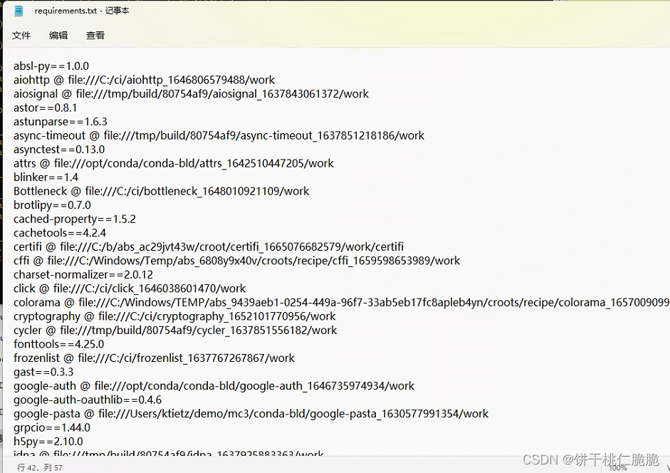 这个时候我的目录下会出现一个requirements.txt ,但是打开文件会发现除了一些直接显示版本号的安装包,有很多会出现 @file .....