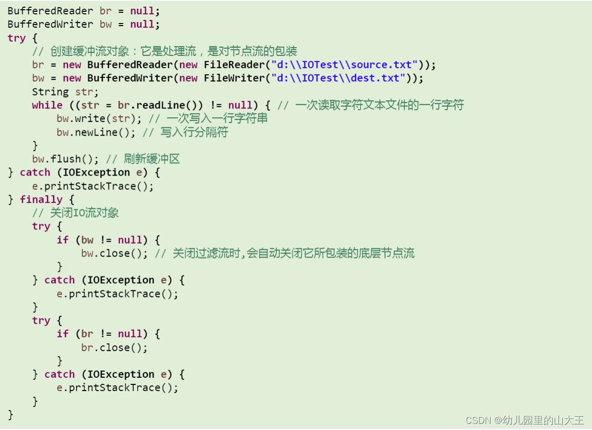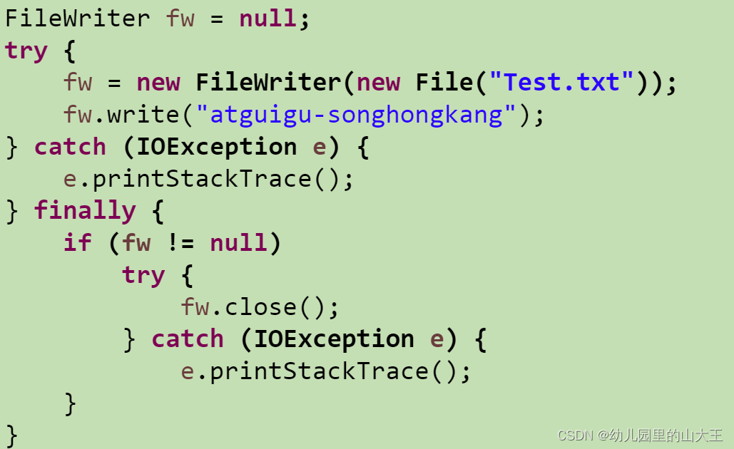注意:程序中打开的文件IO资源不属于内存里的资源,垃圾回收机制无法回收该资源,所以应该