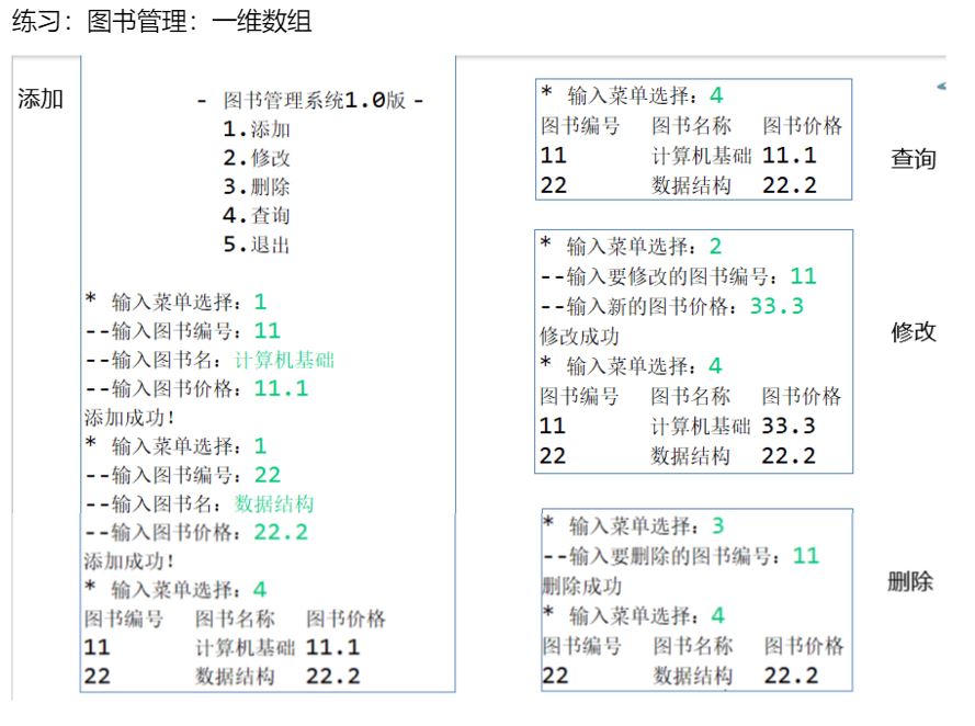 package com.hainiu.book; import java.util.Scanner; //书的属性类 class Books{ private String name; private double price; private int number; public Books(){ } public Books(String name, double price, int number) { this.name = name; this.price = price; this.number = number; } public String getName() { return name; } public void setName(String name) { this.name = name; } public double getPrice() { return price; } public void setPrice(double price) { this.price = price; } public int getNumber() { return number; } public void setNumber(int number) { this.number = number; } public String show(){ return name +","+ price + "," + number; } } class ManagerBooks{ //创建一个数组 相当于书架存放book private Books [] books = new Books[100]; //添加 public void add(Books book){ //循环查看书架 如果没有这本书 那么增加 如果有那么提示已经有这本书了 for (int i = 0; i < books.length; i++) { if(books[i]==null){ books[i]=book; System.out.println("添加成功"); break; }else{ System.out.println("该书已存在"); } } } //修改 public void update(int number,double price){ //循环查看书架 如果有这本书 那么修改 如果没有提示没有这本书 for (int i = 0; i < books.length; i++) { if(books[i].getNumber()==number){ //如果有这个编号 那么改他的价格 books[i].setPrice(price); System.out.println("修改成功"); }else{ System.out.println("该书不存在"); } break; } } //删除 public void delete(int number){ for (int i = 0; i < books.length; i++) { if(books[i].getNumber()==number){ //数组删除用后一个覆盖前一个 for (int j = i; j < books.length-1; j++) { books[j]=books[j+1]; } if(books[books.length-1]!=null){ books[books.length-1]=null; } System.out.println("删除成功"); break; } } } //查询 public void query(){ System.out.println("图书编号\t图书名称 \t图书价格"); for (Books b : books) { if(b == null){ break; } System.out.println(b.show()); } } //退出 } public class TestBooks { public void startsystem(){ Scanner sc = new Scanner(System.in); ManagerBooks mgb = new ManagerBooks(); System.out.println("-----欢迎来到菜单-----"); System.out.println("1、添加 2、修改 3、删除 4、查询 5、退出"); int number; String name; double price; while(true){ System.out.println("请选择菜单"); //录入数字的 int n =sc.nextInt(); switch(n){ //如果是1 那么就是添加 name +","+ price + "," + number; case 1: System.out.println("欢迎来到添加页面"); System.out.println("请输入编号"); number = sc.nextInt(); System.out.println("请输入书名"); name = sc.next(); System.out.println("请输入价格"); price = sc.nextDouble(); Books books = new Books( name, price, number); mgb.add(books); break; //如果是2那么就是修改页面 case 2: System.out.println("欢迎来到修改页面"); System.out.println("输入要修改的编号"); number = sc.nextInt(); System.out.println("输入改的价格"); price = sc.nextDouble(); mgb.update(number, price); break; case 3: System.out.println("欢迎来到删除页面"); System.out.println("输入要删除的编号"); number = sc.nextInt(); mgb.delete(number); break; case 4: System.out.println("欢迎来到查询页面"); mgb.query(); break; case 5: System.out.println("退出页面"); System.exit(0); } } } public static void main(String[] args) { // TODO Auto-generated method stub new TestBooks().startsystem(); } }