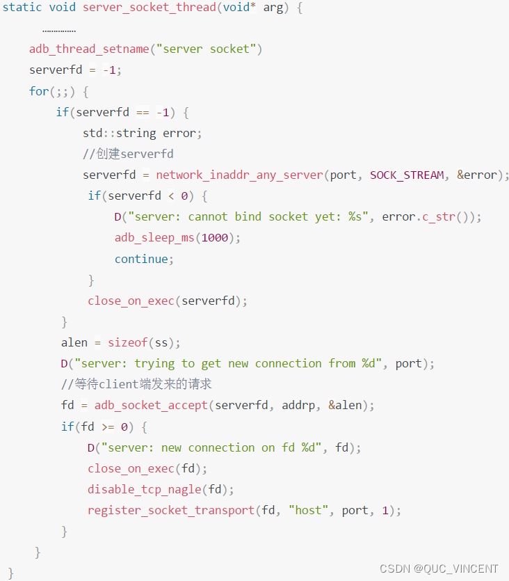 b) 调用 adb_socket_accept()来接受 client 端的请求信息,然后 fd.用于 tcp 的通信