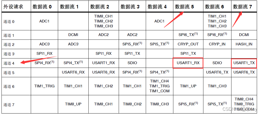 查参考手册选用DMA2的数据流5/7的通道4即可。