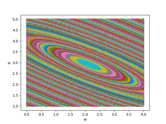 图3-2中,横坐标是一个变量www,纵坐标是另一个变量bbb。两个变量的组合形成的损失函数值,在图中对应处于等高线上的唯一的一个坐标点。w、bw、bw、b所有的不同的值的组合会形成一个损失函数值的矩阵,我们把矩阵中具有相同(相近)损失函数值的点连接起来,可以形成一个不规则椭圆,其圆心位置,是损失值为0的位置,也是我们要逼近的目标。