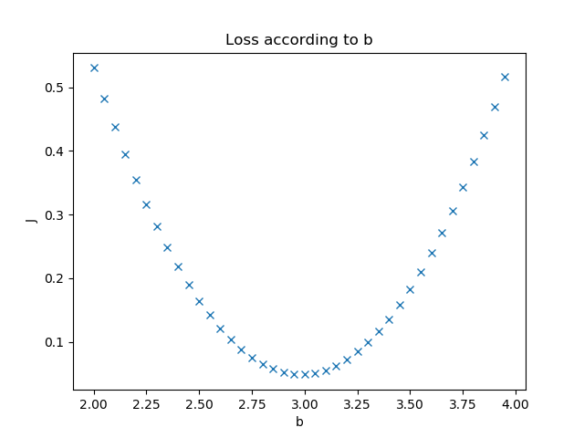 我们假设该拟合直线的方程是y=2x+3,当我们固定w=2,把b值从2到4变化时,看看损失函数值的变化如图3-5所示。