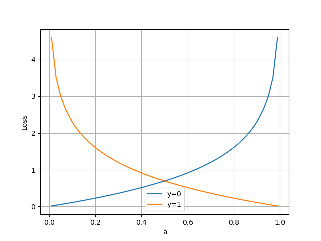 loss=−1m∑imyilog(ai)+(1−yi)log(1−ai)yi∈{0,1} loss = -\frac{1}{m} \sum_i^m y_i log(a_i) + (1-y_i)log(1-a_i) \qquad y_i \in \{0,1\} loss=−m1i∑myilog(ai)+(1−yi)log(1−ai)yi∈{0,1}