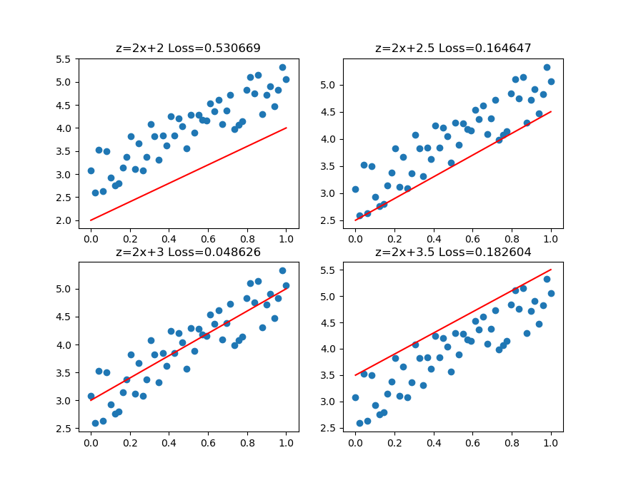 - 第三张,又向上平移了一些,误差计算Loss=0.048,此后还可以继续尝试平移(改变b值)或者变换角度(改变w值),得到更小的损失函数值;