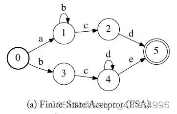 当输入序列为“abbcd”时,这个FSA返回接受,因为存在开始状态 0 到终止状态 5 的一条路径“011125”,使得路径上的标签序列正好等于输入符号序列。当输入序列为“abccd”时,则返回“不接受”,因为不存在满足条件的路径。